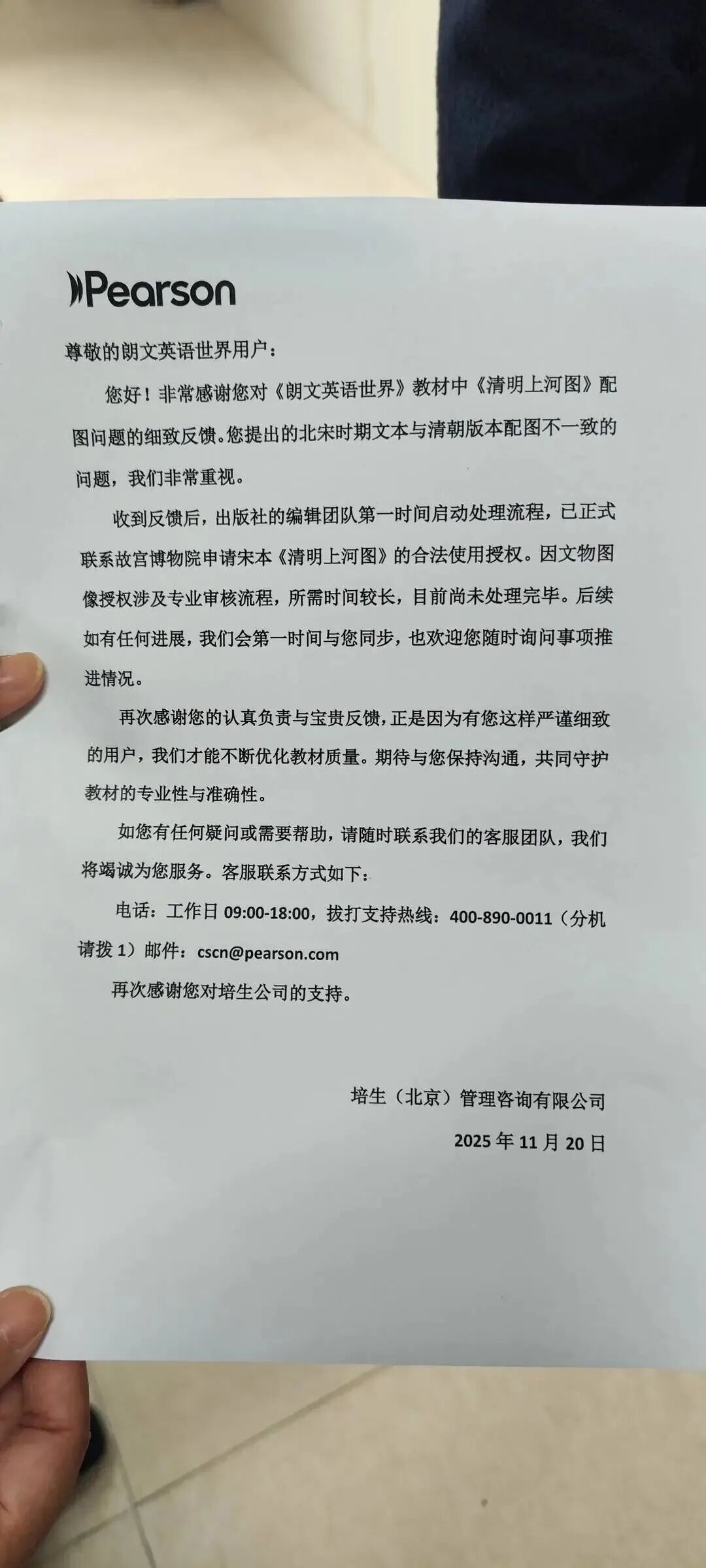 这位十岁的少年在预习《朗文英语宇宙》课本发现:课文论说的是北宋本事的《晴朗上河图》,但所配插图却是清代版块,存在较着史实不符问题。经家长反馈至四川省谈话翰墨课本处后,出书社马上回话,已开动向故宫博物院苦求宋代原邦畿像授权的过程。
